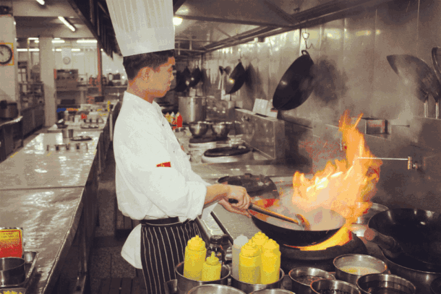 在厨房里靠近火焰的灶台边,温度高达四十多度!厨师们还穿着工作服,带着厨师帽,为的就是给食客们守住健康卫生的底线,让大家吃上安全卫生的饭菜!出品部的家人,你们辛苦了。